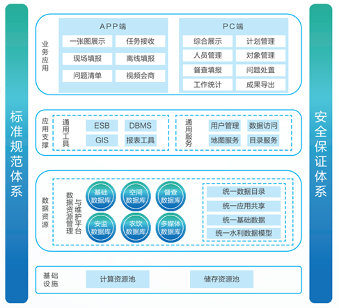 充分利用云計算、大數據、移動互聯、衛星遙感等先進技術,采用面向網絡的多層架構進行設計,整合水利部現有數據資源,形成統一的數據資源池,中間層以組件化、服務化的方式集成水利一張圖、藍信、水利應用門戶等服務中間件,形成標準化的服務能力,前端則分別面向移動端和PC端,以APP和網頁兩種應用模式發布應用系統,滿足不同層級用戶的需求。
